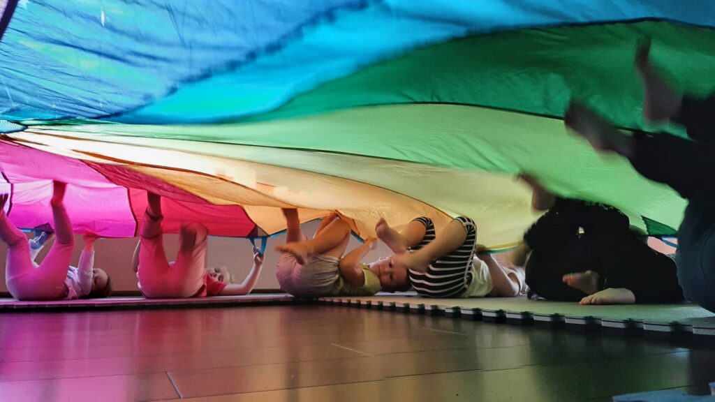 Deti kráčajú okolo padáku, mávajú natiahnutými rukami. Lektor stojí v strede a hovorí: